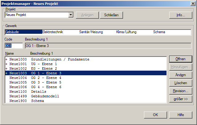 Der Projektmanager organisiert und verwaltet das Projekt. Der Dialog ist nach Gewerken gegliedert. Für jedes Gewerk werden die Modelle in einer Liste mit verschiedenen Informationen geführt.