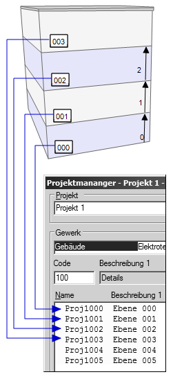 Bauen Sie die Etagen des Gebäudes im Projektmanager folgerichtig von unten nach oben auf.