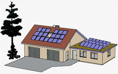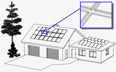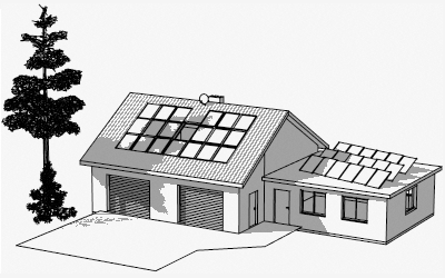 The model appears as a line drawing with a planar representation of the shadows cast.