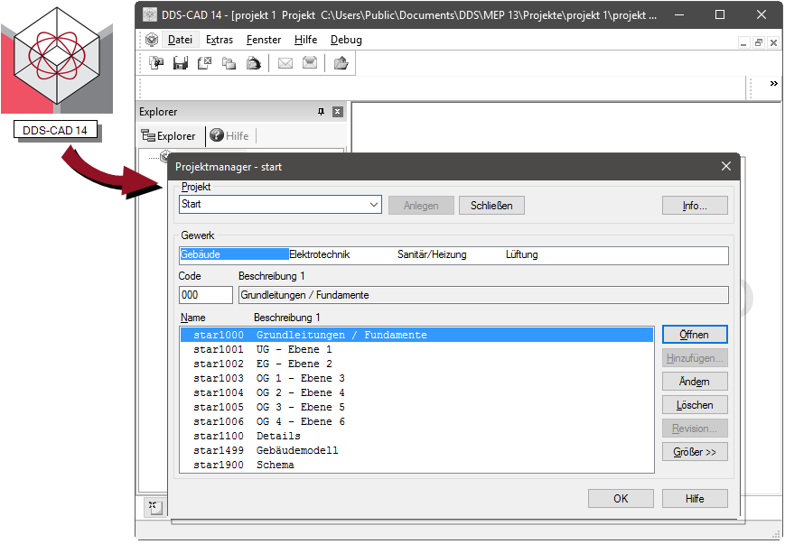 Starten Sie DDS-CAD über das Symbol auf Ihrem Desktop durch Doppelklick. Damit gelangen Sie auf die Projektebene, auf dem Bildschirm erscheint der Projektmanager. Dabei wird automatisch das Projekt Start geöffnet. Sie können es zum Probieren und Testen nutzen, zur Bearbeitung eigener Projekte ist es jedoch nicht geeignet. Zu diesem Zweck erzeugen und verwalten Sie ihre eigenen Projekte.