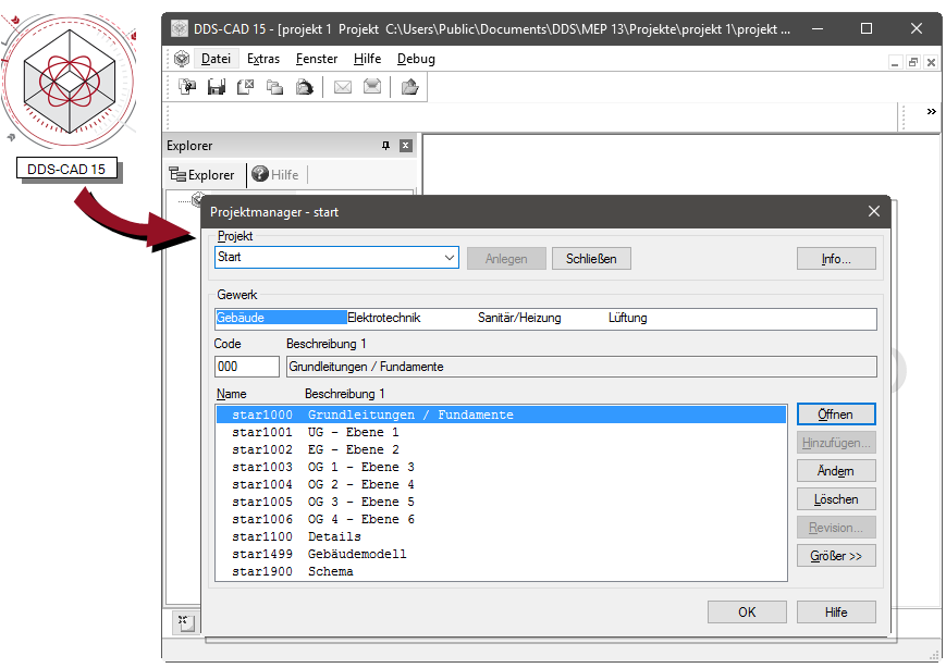 Starten Sie DDS-CAD über das Symbol auf Ihrem Desktop durch Doppelklick. Damit gelangen Sie auf die Projektebene, auf dem Bildschirm erscheint der Projektmanager. Dabei wird automatisch das Projekt Start geöffnet. Sie können es zum Probieren und Testen nutzen, zur Bearbeitung eigener Projekte ist es jedoch nicht geeignet. Zu diesem Zweck erzeugen und verwalten Sie ihre eigenen Projekte.
