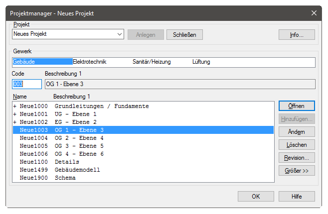 Der Projektmanager organisiert und verwaltet das Projekt. Der Dialog ist nach Gewerken gegliedert. Für jedes Gewerk werden die Modelle in einer Liste mit verschiedenen Informationen geführt.