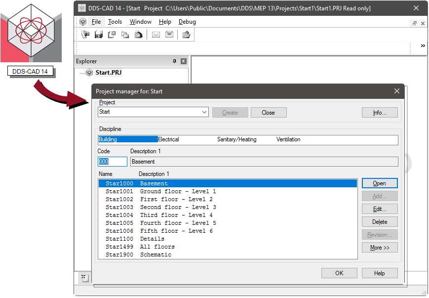 Start DDS-CAD by double clicking the desktop icon. This will take you to the project level, and the Project manager appears on the screen. The project Start will be automatically opened. You can use it to try and test, but to edit your own projects it is not suitable. For this purpose, create and manage your own projects.