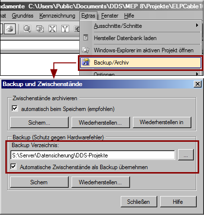Die Backupfunktionen dienen dem Schutz gegen Datenverluste, die durch Hardwarefehler (z. B. eine defekte Festplatte) entstehen können. Nutzen Sie diese Möglichkeit, wenn Sie Ihre Projekte z. B. auf der lokalen Festplatte des Arbeitsplatzes verwalten und keine regelmäßige Datensicherung durchführen.