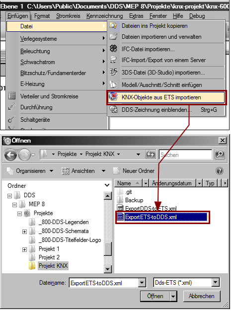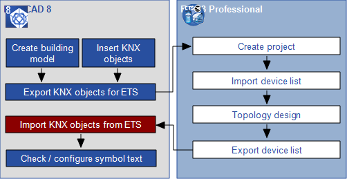 Until version 7.3, no interaction was possible between DDS-CAD and ETS (Engineering Tool Software ™, a program for planning, commissioning and managing KNX systems, see Hompage). DDS-CAD 8 and ETS 3 can now exchange their data with each other, resulting in the outcome of an integrated planning process. Note to ETS 4... The interface within DDS-CAD has been prepared. Our partner, IT GMBH, is working on the release of the interface for ETS 4. The principle of the data exchange will remain the same between both tools.
