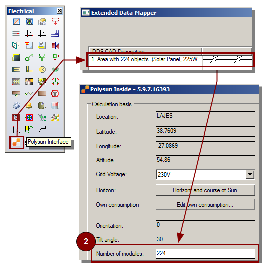 In the previous version, the number of modules taken from the DDS-CAD model were not editable. That is, for a realistic result the module field in DDS-CAD (1) had to be designed in such a way as to be considered in the yield calculation (2). In the new version you can edit the number of modules in the yield calculation dialog. You can combine, for example, two module field (from DDS-CAD) and calculate it as a single field in Polysun Inside.