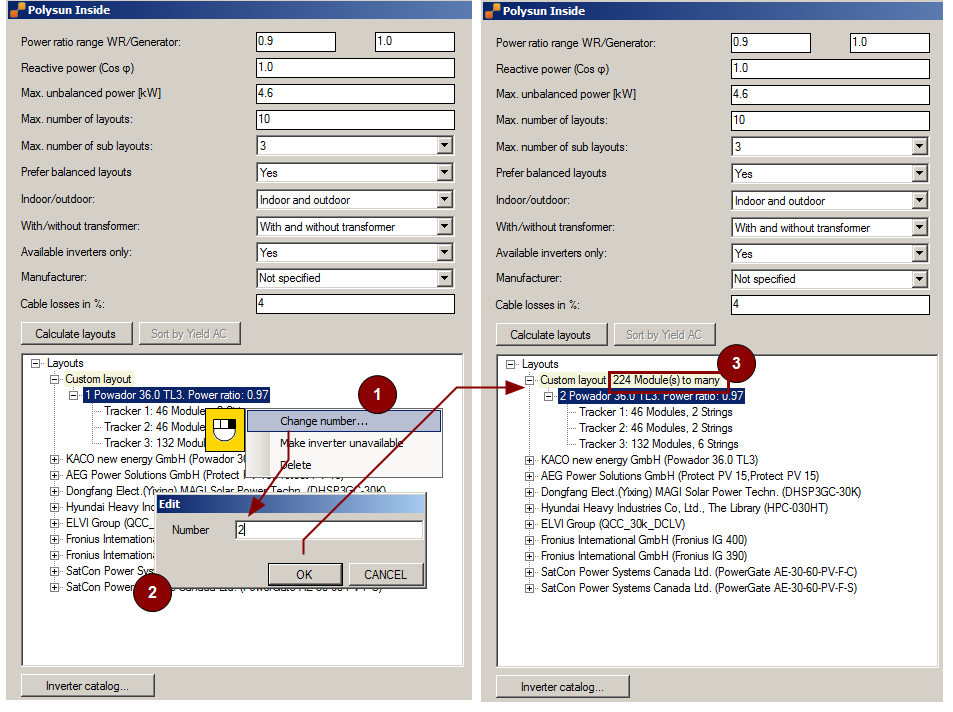 In the inverter selection you can have Polysun Inside calculate and propose possible inverter combination or define them manually. Now it is also possible to copy and reproduce a configured inverter from the calculation (in the previous version...