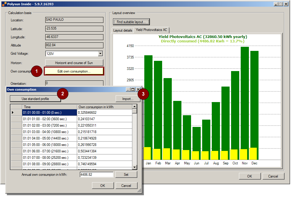 With the new version of Polysun Inside you can take into account the own consumption in the yield calculation (1). It is represented together with the estimated AC yield and also included in the report files. The consumption profile of the connected unit can be imported from a measurement file (2). If, however, no measurement file is available a standardized consumption profile can be used by selecting one of the provided defaults (3).